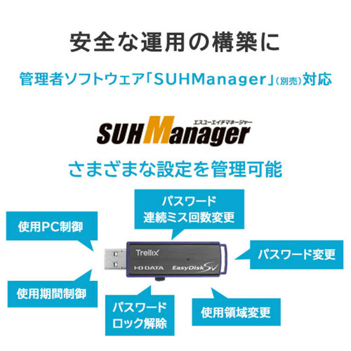 ●安全な運用の構築に!管理者ソフトウェア「SUHManager」(別売)対応 パスワードの詳細変更や利用環境制限など、さまざまな設定が可能です。セキュリティが必須とされる、企業のUSBメモリーを活用したビジネスを強力にバックアップします。