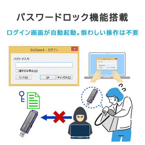 ●盗難・紛失対策に!パスワードロック&ハードウェア自動暗号化機能搭載・パスワードロック機能(SUGate4)搭載 パスワードを入力してログインするまではデータ保存領域へアクセスできないため、盗難や紛失時にも内部データを読みとられるリスクを軽減させます。自動起動ツールを有効にすると、本商品をPCに挿すだけでログイン画面が自動起動。煩わしい操作は必要ありません。※パスワードの入力ミスの上限は5回まで、上限に達するとロックがかかります。 ロック解除には添付ソフト「SUReset4」もしくは別売の管理ソフトウェア「SUHManager」で 初期化を行ってください。初期化すると、本商品に保存したデータはすべて消去されます。 ・ハードウェア自動暗号化機能(AES256bit)搭載 データ保存領域に書き込まれるデータは、コントローラーがAES256bitで全て自動暗号化。フラッシュメモリーをはがして別基板に載せてもデータの閲覧はできません。