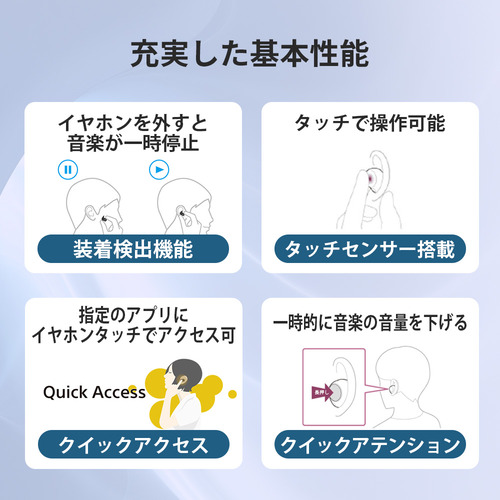 主な付属品:ハイブリットイヤーピース(SS、M、LL 各2)、充電ケース、USB Type-C(R)ケーブル(USB-A - USB-C(R))、保証書(仕様上のご注意/主な仕様に記載)