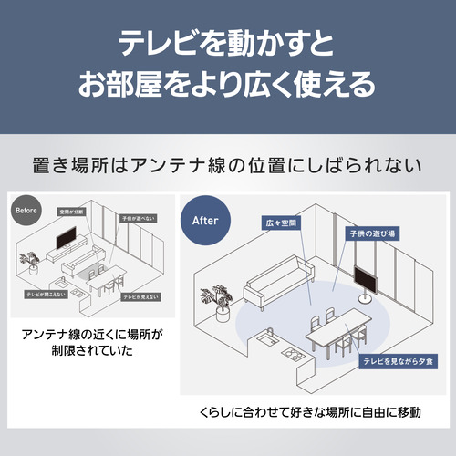 チューナー部からモニターに、4K映像をワイヤレスに送信。モニターとチューナー部の無線接続で、配線を気にせず好きな場所で楽しめます。