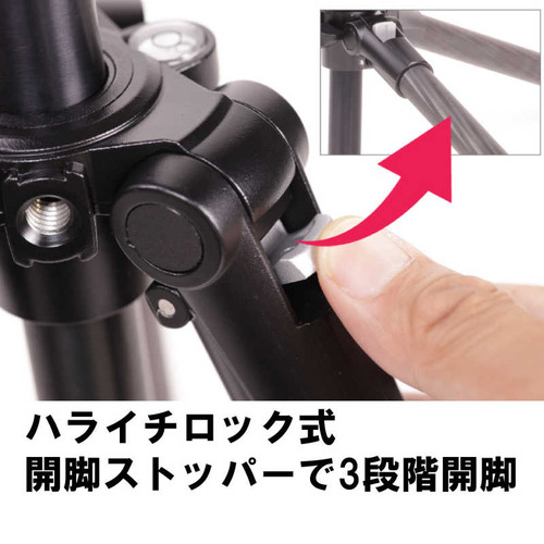 ●ベーシックなカーボン三脚「ライトカーボンE73」がハライチロック式開脚機構の採用でリニューアル。パイプ径25mmの中型タイプの3段「ライトカーボン E73 II」として発売します 。ボタンを押しこんで開脚できるハライチロック式開脚機構は、 軽い力で操作でき、操作性が向上。本体部分に水準器とU3/8のアクセサリーネジ穴装備。 脚パイプは新たなLCIIカーボンパイプにより、空転防止と手頃な価格を実現しました。 雲台は2ハンドル3ウェイの「SH-705雲台」(専用雲台)。カメラ着脱はダブルナット式でしっかり固定します。さらにエレベーター下部に雲台や別売のフックが取り付け可能なネジを装備。雲台込みで1.7kgの軽さと1,775mmの高さを実現しています。三脚ケース付き。