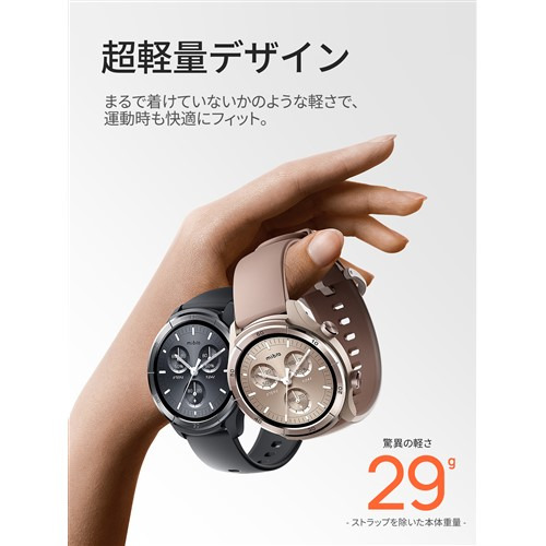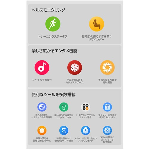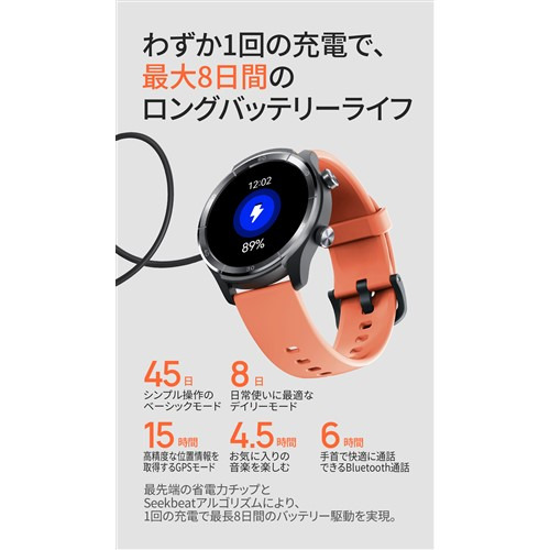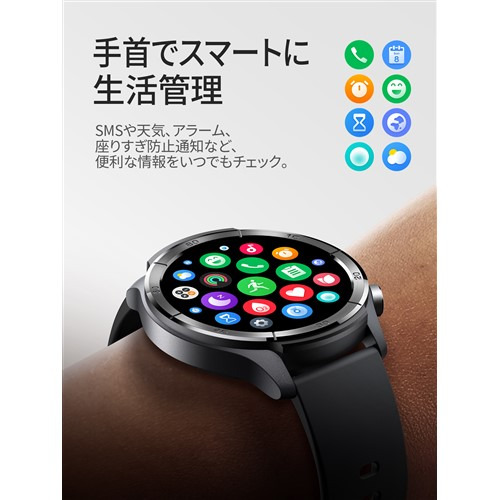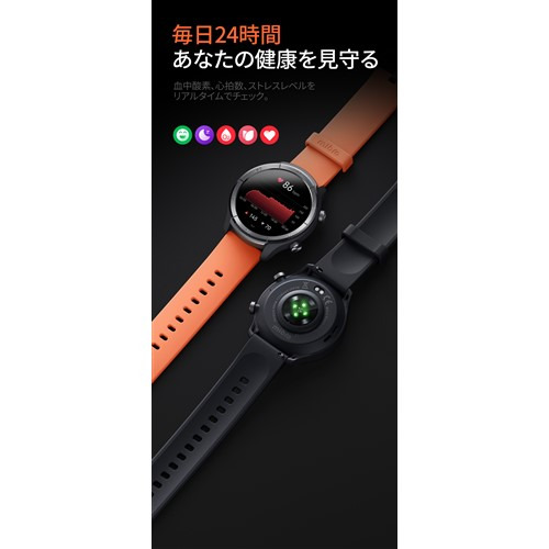 主な機能:心拍数モニタリング、ストレスモニタリング、睡眠モニタリング、歩数、カロリー消費、血中酸素レベル測定、様々なスポーツモード、着信、アプリ通知、音声通話、天気予報、気圧高度計、スマートフォンを探す