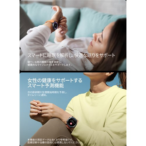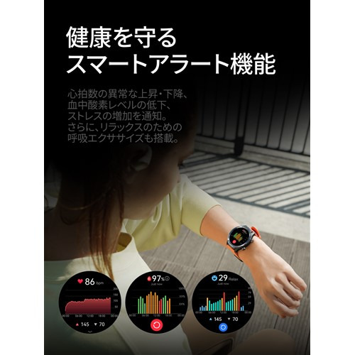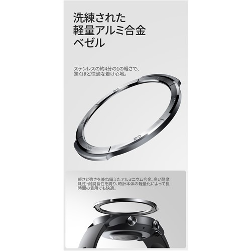 主な機能:心拍数モニタリング、ストレスモニタリング、睡眠モニタリング、歩数、カロリー消費、血中酸素レベル測定、様々なスポーツモード、着信、アプリ通知、音声通話、天気予報、気圧高度計、スマートフォンを探す