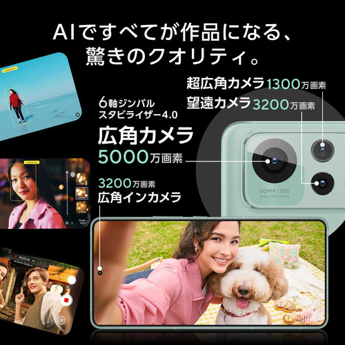 広角カメラに6軸ジンバルスタビライザーを搭載しているため、綺麗で滑らかな動画や静止画を撮影可能。AIトラッキング、AIピンボケ補正、AIポートレート動画などAIを活用した便利な機能で撮影環境を選ぶことなく、プロ級の写真や動画をスマートフォンで気軽に撮影できます。