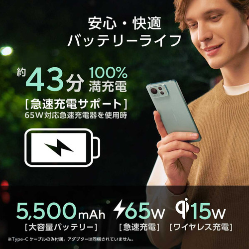 5,500mAhの大容量バッテリー搭載だから一日中思い切り使用できます。最大65Wの急速充電に対応しています。さらにQi規格のワイヤレス充電に対応しており、最大15Wでの高速充電が可能です。うっかりな充電忘れも怖くありません。※Type-Cケーブルのみ付属。アダプターは同梱されていません。