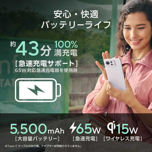 5,500mAhの大容量バッテリー搭載だから一日中思い切り使用できます。最大65Wの急速充電に対応しています。さらにQi規格のワイヤレス充電に対応しており、最大15Wでの高速充電が可能です。うっかりな充電忘れも怖くありません。※Type-Cケーブルのみ付属。アダプターは同梱されていません。