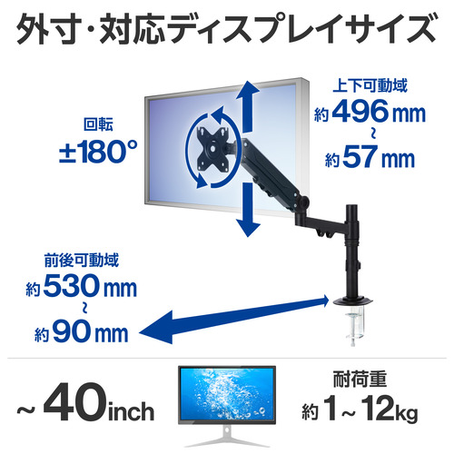 ●40インチサイズまでのモニターに対応する、ロングアームのメカニカルスプリング式シングルモニターアームです。