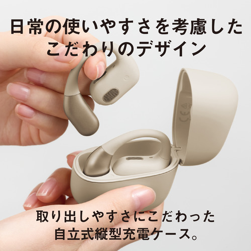 ●縦に収納できる自立式の充電ケースのため、コンパクトで持ち運びに便利。●耳の形に沿ってやさしくフィットする、柔らかく肌触りの良いシリコン素材で長時間使用しても疲れにくい。