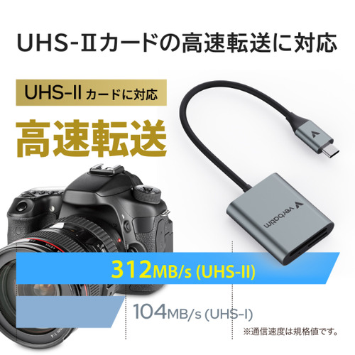 最大転送速度312MB/s(理論値)※ SD/microSDカードへの高速転送が可能 ※UHS-II規格のカードを使用した際の理論値となります。
