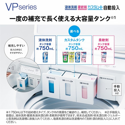 酸素系液体漂白剤や、おしゃれ着用洗剤の自動投入はもちろん、異なる銘柄の液体洗剤や柔軟剤の使い分けなど
