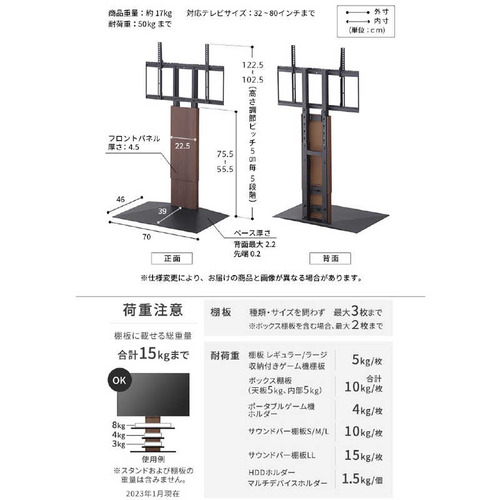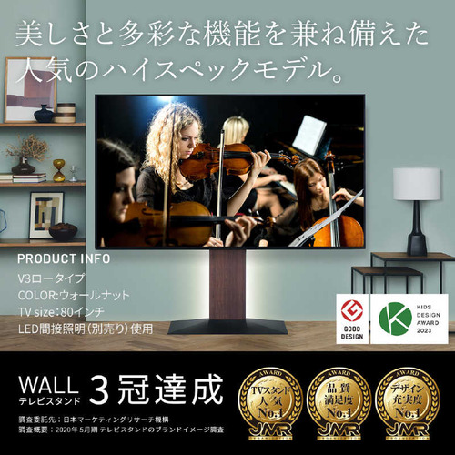 ●「テレビを壁にする」大型テレビを設置してもお部屋を広く、美しくつかえるWALLテレビスタンド。最大80V型の大型テレビに対応し高さ調節、背面収納などの機能面とフラットで薄型なデザイン性を両立させた壁寄せタイプのテレビスタンドです。●空間と同化するフラットでスリムなデザイン安全性を考慮し段差を極限までなくした厚さ2mmの3DフラットベースとL字デザインで床や壁と一体化するデザイン。シンプルモダンなデザインで2017年度グッドデザイン賞を受賞。カラーもインテリアにも合わせやすい4色展開。●高さを調節し、自由な視聴スタイルが楽しめる部屋のレイアウトや視聴スタイルに合わせ、好みの高さにスタンドの高さを調整可能。高さは5cmピッチで5段階に調整できます。支柱部のフロントパネルはスライド式の構造。高さを調節してもパネル部分もスライドして美しい形状を保ちます。●美しくあるために、すべてを背面に収納部屋の景観を損なわないようにテレビのコード類やタップも背面に収納可能です。背面がすっきりするので日常のお手入れも簡単です。●大型テレビ対応テレビの大型化に対応して80インチまでのサイズに対応(総耐加重50kgまで)。また、スペースの狭い場所でも省スペースなWALLテレビスタンドなら大型テレビを設置できます。●工事不要で壁掛けテレビスタイルを実現工事が必要な壁掛けテレビですが壁よせテレビスタンドを使用することで手軽にスタイリッシュな壁掛けスタイルを実現。設置後の高さの変更や場所の変更も簡単なので便利です。