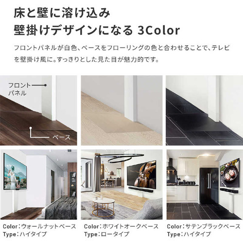 ●「テレビを壁にする」大型テレビを設置してもお部屋を広く、美しくつかえるWALLテレビスタンド。最大80V型の大型テレビに対応し高さ調節、背面収納などの機能面とフラットで薄型なデザイン性を両立させた壁寄せタイプのテレビスタンドです。●空間と同化するフラットでスリムなデザイン安全性を考慮し段差を極限までなくした厚さ2mmの3DフラットベースとL字デザインで床や壁と一体化するデザイン。シンプルモダンなデザインで2017年度グッドデザイン賞を受賞。カラーもインテリアにも合わせやすい4色展開。●高さを調節し、自由な視聴スタイルが楽しめる部屋のレイアウトや視聴スタイルに合わせ、好みの高さにスタンドの高さを調整可能。高さは5cmピッチで5段階に調整できます。支柱部のフロントパネルはスライド式の構造。高さを調節してもパネル部分もスライドして美しい形状を保ちます。●美しくあるために、すべてを背面に収納部屋の景観を損なわないようにテレビのコード類やタップも背面に収納可能です。背面がすっきりするので日常のお手入れも簡単です。●大型テレビ対応テレビの大型化に対応して80インチまでのサイズに対応(総耐加重50kgまで)。また、スペースの狭い場所でも省スペースなWALLテレビスタンドなら大型テレビを設置できます。●工事不要で壁掛けテレビスタイルを実現工事が必要な壁掛けテレビですが壁よせテレビスタンドを使用することで手軽にスタイリッシュな壁掛けスタイルを実現。設置後の高さの変更や場所の変更も簡単なので便利です。