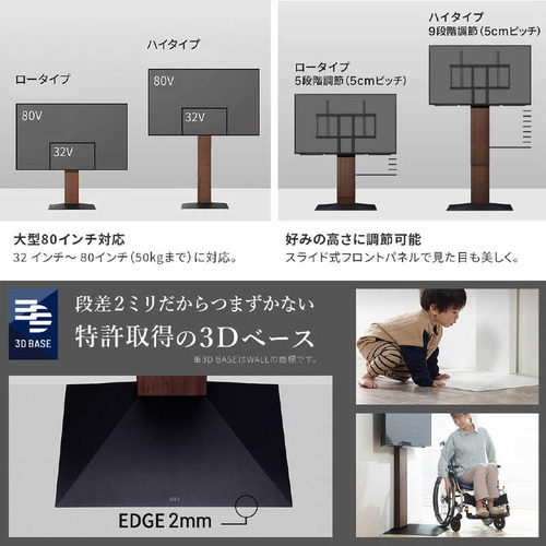 ●32〜80型対応 首振り機能付き WALL TVスタンド V3 SW ハイタイプ 人気のWALL TVスタンドV3シリーズに首振り機能付きモデルが新登場。視聴する場所に合わせて左右にテレビの向きが変えられるので視聴空間がより快適に。●場所を選ばずより快適に視聴ができる首振り機能付き 左右に角度調整ができるので視聴する場所にあわせて向きを変えたり、光の反射が気になる時は角度を調整したりより快適にテレビを楽しめます。角度は左右最大約18度まで変更可能。*テレビサイズにより角度調整の可動範囲は変わります。サイズが大きくなるほど角度調整の範囲は狭くなります。また、調整の際はテレビが壁に当たらないようにご注意ください。●空間と同化するフラットでスリムな薄型デザイン 安全性を考慮し段差を極限までなくした厚さ2mmの3Dフラットベースと薄型デザインで床や壁と一体化。グッドデザイン賞をはじめとした国内外のデザイン賞を受賞しています。また、インテリアに馴染むデザインで大型テレビを省スペースにすっきりと設置ができるのでお部屋が広々として有効に使えます。●テレビは大型の80型まで対応。5段階に高さ調節も可能 テレビサイズは32〜80型まで対応(重量は50kgまで)。テレビの高さはお好みに合わせて5段階(5cmピッチ)に調整可能です。ロータイプはソファや床からの視聴に最適。●配線はすっきりと背面に収納可能。薄型ベースでお手入れも簡単 テレビの配線、周辺機器のコード類やタップは背面にまとめて収納可能です。また、足元のベースが薄型なので掃除機もかけやすく日常のお手入れが簡単です。●豊富なカラーバリエーション。インテリアに合わせて選べる6色 カラーはインテリアに合わせやすいサテンホワイト、サテンブラック、ウォールナット、ホワイトオークの4色と床の色との一体感を高めるウォールナットベース、ホワイトオークベースの6色展開。●専用オプションで自由にカスタマイズ可能 豊富な専用オプションを用途に合わせてスタンドと組み合わせてお使いいただけます。V3対応のオプション品がお使い頂けます。●安心の耐震性 震度7での耐震試験を実施済。テレビとスタンドが一体化することで転倒しにくくなり耐震性がアップします。*自社基準にて耐震性を検証しております。すべての環境での耐震性を保証するものではありません。