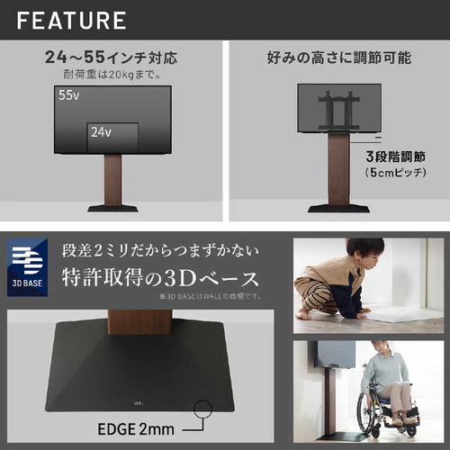 ●小型テレビと組み合わせてバランスのいいデザイン 小型テレビと組み合わせやすいサイズ感だけでなく、圧迫感がないように支柱やベースの角にアールをつけデザイン的にもバランスを追求しました。テレビは24型から55型まで対応します。(耐荷重は20kg)*テレビの取付確認はメーカーサイトのWALLテレビ対応表でご確認頂けます。●コンパクトサイズで設置場所は自由 段差を極限までなくした厚さ2mmの3Dフラットベースとコンパクトなベースサイズで狭いお部屋でも自由にレイアウトできます。寝室や子供部屋などパーソナルな場所でも設置しやすいサイズです。●インテリアに合わせやすい4色展開 カラーはサテンホワイト、サテンブラック、ウォールナット、ホワイトオークの4色。インテリアに合わせてお選び頂けます。●高さ調整可能 テレビの高さは5cmピッチで3段階に調整可能。お好みの高さに設定ができます。●別売りオプションでカスタマイズ可能 レコーダー、サウンドバーが置ける棚類や、HDDホルダー、コードを綺麗にまとめるコーカバーなど用途に合わせて専用オプションを組み合わせて使用できます。WALL V3ハイタイプ、ロータイプとは支柱の幅が異なります。オプションの棚板類はV3mini専用のオプションをお使い下さい。