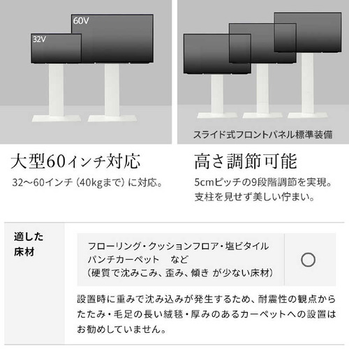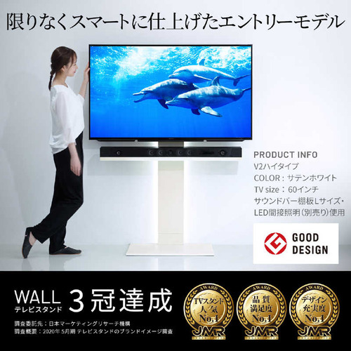 ●「テレビを壁にする」WALLテレビスタンドV2は壁掛けテレビのように美しく、壁掛けテレビよりよりも自由であらゆる場所をテレビを楽しむ空間に変えます。32〜60V型のテレビに対応し高さ調節、背面収納などの機能面とフラットで薄型なデザイン性を両立させた壁寄せタイプのテレビスタンドです。●空間と同化する、フラットでスリムなL型デザイン正面からネジやネジ穴がみえないインテリアと調和するデザイン。足元のベースもフラットで薄く室内で使いやすく設計しています。2017年グッドデザイン賞受賞。●美しくあるために、すべてを背面に収納部屋の景観を損なわないようにテレビのコード類やタップも背面に収納可能です。背面がすっきりするので日常のお手入れも簡単です。●自由自在に、観やすい高さへと調節可能部屋のレイアウトや視聴スタイルに合わせ、好みの高さにスタンドの高さを調整可能。高さは5cmピッチで9段階に調整できます。支柱部のフロントパネルはスライド式の構造。高さ調整してもパネル部分もスライドして美しい形状を保ちます。●工事不要で壁掛けテレビスタイルを実現工事が必要な壁掛けテレビですが壁よせテレビスタンドを使用することで手軽にスタイリッシュな壁掛けスタイルを実現。設置後の高さの変更や場所の変更も簡単なので便利です。