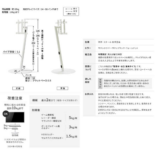 ●「見たい場所へ、使う場所へ。」置く場所を選ばず自由に設置ができるWALL TVスタンド A2フラットベース ハイタイプ。24〜55V型のTVに対応。スマートな7の字型のデザインでテレビを省スペースに設置可能。薄型のコンパクトな円型ベースなので家のいろいろな場所で使用が可能です。シンプルなデザインでインテリアに合わせやすく、高さ調節やコード収納などの使いやすい機能も充実。高めにテレビ画面を設定できるので家族でのゲームやモニターを見ながらのフィットネスなどアクティブな使い方にも。●コンパクトで置き場所、自由自在角のない円型のフラットベースだから省スペースで、狭いスペースや部屋のコーナーなど場所を選ばず設置できます。また、厚さが5mmの薄型ベースなので床と一体化してスッキリ設置可能です。●インテリアに合わせやすい選べる3カラーシンプルでインテリアに合わせやすいブラックとホワイト、高級感のある支柱部分が木目のウォールナットの3カラー。●美しさや使いやすさを追求したシンプルデザイン重心やバランスを追求した7の字型フレーム。支柱の内部に配線を隠して通せる仕様ですっきり設置できます。●高さ調整テレビの高さは5段階(5cmピッチ)で調節ができます。ダイニングテーブルの横や寝室での使用にも便利。●24〜55型のテレビに対応テレビは24型から55V型まで対応します。(耐荷重は20kg)*テレビの取付確認はメーカーHPのテレビ対応表でご確認頂けます。●豊富な別売りオプションレコーダー、ゲーム機、サウンドバーが置ける棚類や、HDDホルダー、コードを綺麗にまとめるコーカバーなど豊富なオプション類を組み合わせて使用できます。●耐震性震度7での耐震試験を実施済。*自社基準にて耐震性を検証しております。すべての環境での耐震性を保証するものではありません。
