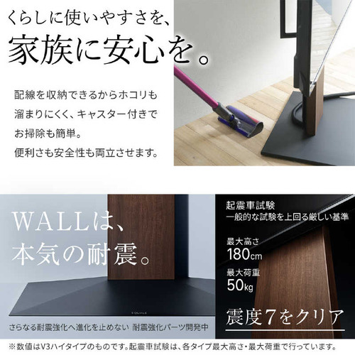 ●32〜80V型対応テレビスタンド WALL TVスタンド V5ロータイプ自立して使用できるWALL TVスタンドV5はお部屋のコーナや部屋の中間地点のような位置にテレビを置くことが可能で使用する場所を選びません。キャスター付きでスムーズに移動ができレイアウトの変更やお掃除、テレビの向きの変更も簡単に行えます。●キャスター付きでスムーズに移動独自開発した低床キャスターをベースの裏側にバランスよく16個配置。荷重が分散されるので大型テレビもスムーズに動かせます。少し近づけて視聴したい時、テレビの向きを変えたい時、お掃除の際に少し移動させたい時などとても便利。ベース部分の厚みも2.5cmと薄型で邪魔になりません。●自立タイプなのでレイアウトフリー自立タイプなので壁に寄せても、部屋のコーナーや壁から離れた場所でも自由に設置ができます。●移動を楽にするハンドグリップ付き掴みやすいハンドグリップ付きなので移動させる際もスムーズ●背面カバー付きで配線もきれいに収納支柱の背面を通す配線コードやケーブル類を背面カバーで見た目もすっきり収納。●高さを調節し、自由な視聴スタイルが楽しめる部屋のレイアウトや視聴スタイルに合わせ、好みの高さにスタンドの高さを調整可能。高さは5cmピッチで4段階に調整できます。ソファーに座っての視聴に最適。●80型までの大型テレビに対応取付可能なテレビは32〜80V型までのサイズに対応(耐加重50kgまで)。*テレビの取付確認はメーカーHPのテレビ対応表でご確認頂けます。●部屋にあわせやすい3カラー色は、部屋の雰囲気とコーディネートしやすい3色展開。テレビフレームと一体化するサテンブラック、壁と一体化するサテンホワイト、インテリアと調和するウォールナットの3色。●オフィスでのミーティング用にも最適自立タイプなのでオフィスの空きスペースでテーブルと組み合わせれば少人数で自由に打ち合わせのできる●耐震性震度7での耐震試験を実施済。*自社基準にて耐震性を検証しております。すべての環境での耐震性を保証するものではありません。