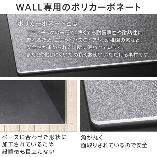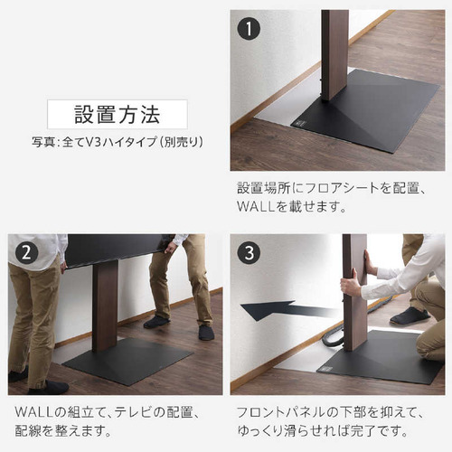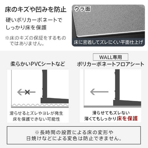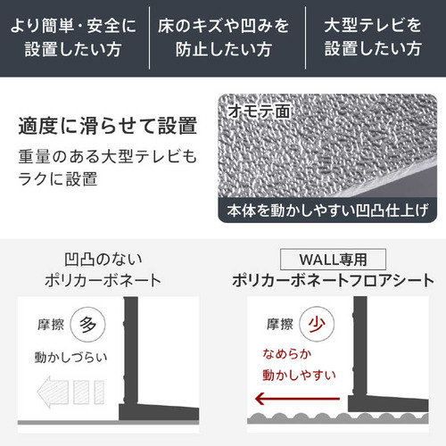 ●WALL V3ロータイプ専用ポリカーボネートフロアシートWALLテレビスタンドをより簡単に安心して設置していただけるポリカーボネート製の専用フロアシートです。WALLテレビスタンドのV3、V2、S1各タイプに対応したサイズをご用意。設置の際の移動を簡単にし、床を保護します。重量のある大型テレビの設置にお勧めです。●滑らせて設置ができ床の傷を防止 硬度があり耐衝撃性に優れるポリカーボネートは劣化しにくく長くお使いいただける素材です。●硬いポリカーボネート製で床の傷や凹みを防止 硬度があり耐衝撃性に優れるポリカーボネートは劣化しにくく長くお使いいただける素材です。角はスタンドのベースの形にあわせた形状に丸く加工されているので設置後も目立たず安心。●設置のお手入れも簡単 設置後の配線変更の際や、背面のお掃除で少し動かしたいときにも便利です。