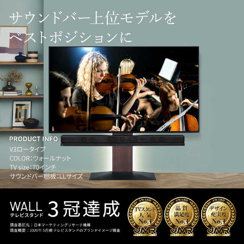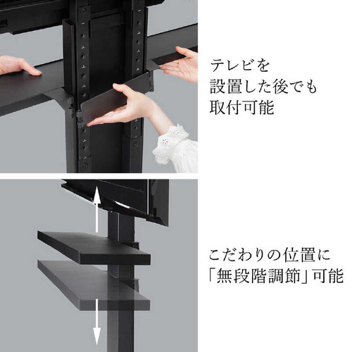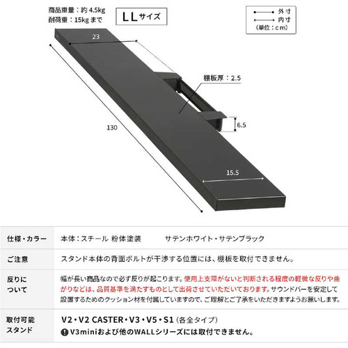 ●取り付けは簡単、好きな高さに取り付け可能スタンドのフロントパネル部分に取り付けることができ、取り付けはテレビを取り付けた状態でも可能。高さはフロントパネルの範囲で無段階に調整できます。押し付けて固定するのでネジ穴もなく美しく設置できます。●使いやすく機能的棚板の耐荷重は15kgまで(LLサイズ)●サウンドバーの幅にあわせて選べる幅130cmまでのサウンドバーに対応します。大型のサウンドバーをテレビと組み合わせてスッキリと設置できます。他にSサイズ(幅60cm)、Mサイズ(幅95cm)、Lサイズ(幅118cm)がございます。●カラーはサテンブラックとサテンホワイトの2色。●対応スタンド:V2・V3・V5・S1への取り付けが可能