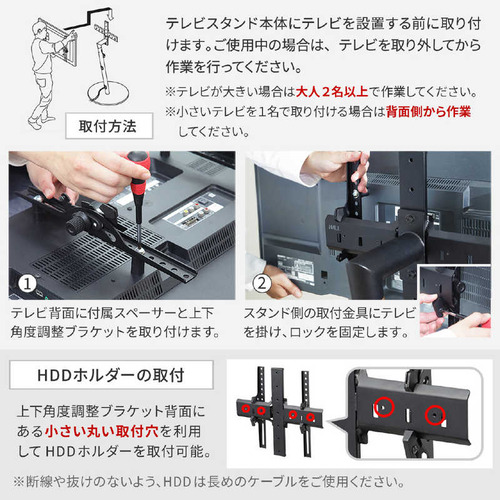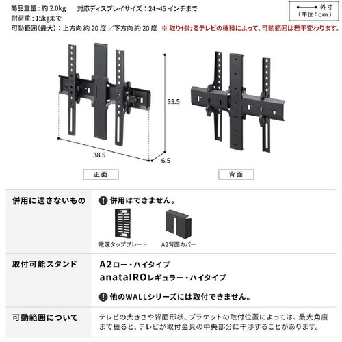 ●WALLテレビスタンド A2ロー/ハイタイプ対応 上下角度調整ブラケットWALLテレビスタンドA2ロータイプ、ハイタイプの専用オプション。テレビ・モニターを見たい角度に上下調整できる角度調整ブラケットです。●さらなる没入感へ テレビの設置や移動が自由な「WALL A2」はよりテレビをより身近な環境でお使い頂けます。上下角度調整ブラケットを使用すれば少し下に傾けてソファーでリラックスした態勢で鑑賞したり、立った状態でゲーム画面を見やすくするために上向きにしたりとより没入感が得られます。●上下に角度が変えられます 上下角度調整ブラケットはお手持ちのテレビスタンドの部品と付け替えて使用できます。上下それぞれ最大約20度、無段階で設定できます。*テレビにより調整できる角度が若干異なります。●対応機種 WALL A2ロータイプ、ハイタイプとWALL anataIROレギュラータイプ、ハイタイプに取付が可能です。●取付可能なテレビ・モニタ 上下角度調整ブラケットに取り付けできるテレビ・モニターサイズは45インチ・15kgまで。*WALL A2ロータイプ・ハイタイプ、anataIROレギュラータイプ・ハイタイプへのテレビ・モニターの取付可否はWALLテレビ対応表でご確認下さい。
