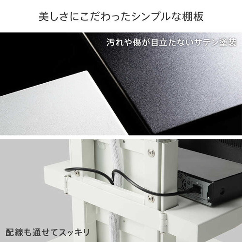 ●WALL TVスタンドV4専用棚板90インチまで対応したインテリアテレビスタンド「WALL TV STAND V4」専用棚板大型レコーダーやPS5などのゲーム機を美しく設置できるテレビスタンド「WALL TV STAND V4」専用オプションです。すっきりとしたデザインでスマートに大型テレビを楽しめます。●取り付けは簡単、好きな高さに取り付け可能 スタンドのフロントパネル部分に取り付けることができる棚板。取り付けはテレビを取り付けた状態でも可能。高さはフロントパネルの範囲で無段階に設定できます。●使いやすく機能的 棚板の耐荷重は棚板全体で5kg。レコーダーやゲーム機をすっきりと設置できます。棚板やサウンドバー棚は合わせて3枚まで組み合わせて取り付けができます(合計耐荷重15kgまで)。●本体の色に合わせた2カラー ブラックとホワイトの2色からお選びいただけます。塗装はスタンド本体と同じ細かな凹凸感がある仕上げです。