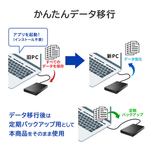●PC入れ替え時に必要な「データ移行」でのお困りごと 2025年10月14日にマイクロソフト社のWindows 10のサポートが終了します。Windows 11非対応のPCを使用している方は、新しいPCが必要で新しいPCを導入するにあたり、必要なのが古いPCからの“データ移行”です。データ移行の方法は難しく、不安に感じる方も多いでしょう。●内蔵アプリ「Sync Connect+ データ移行マネージャー」で、データ移行をスムーズに実施! データ移行アプリ「Sync Connect+ データ移行マネージャー」が内蔵されています。ロックを解除後、アプリが自動で起動し、旧PCへのアプリダウンロードは不要、直感的に操作できる画面になっているので、旧PCから新PCへのデータ移行がとてもかんたんに行えます。●ファイルコピーよりも高速なバックアップが可能! 「Sync Connect+ データ移行マネージャー」を使用すると、通常のファイルコピーよりも高速なバックアップが可能です。完了までの待ち時間が減り、より効率よくデータ移行を進めることができます。●ネット環境は不要!オフラインでも作業できる 本商品でのデータ移行なら、インターネット環境は不要。ネット環境に依存しないため、通信障害などの心配なくバックアップを実行できます。※バックアップソフト「Sync Connect+」をインストールする際はインターネット接続が必要になります。●小さいのに大容量!写真や動画の受け渡しに便利! スタイリッシュなデザインと機能性を追及し、手のひらサイズのコンパクトさを実現しています。持ち運びに最適なポータブルハードディスクです。