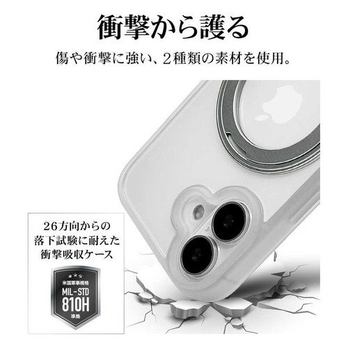 ●ボタンやカメラ周りの細部まで保護できる精密設計です。●米軍MIL規格「MIL-STD-810H」最新の衝撃基準規格に準拠。●アメリカ国防総省で定められた、米軍調達品基準に準拠した規格で、26方向からの落下試験に耐えた衝撃吸収ケースです。●指が通せて操作安心、120度開閉&360度回転でお好みの角度に調整可能な、MagSafe対応リング付き。使用しない時はスリムに収まります。※背面のリングを使用する際は必ず端末とケースを一緒に手に持ってください。リングのみを持って宙づりにしたり、振り回す等の行為はしないでください。端末の落下や本製品の破損の原因となります。●リングを開いて縦置き・横置きの視聴スタンドとしても使用できます。●柔軟性のあるTPU素材と傷に強いポリカーボネートのハイブリッドケースです。