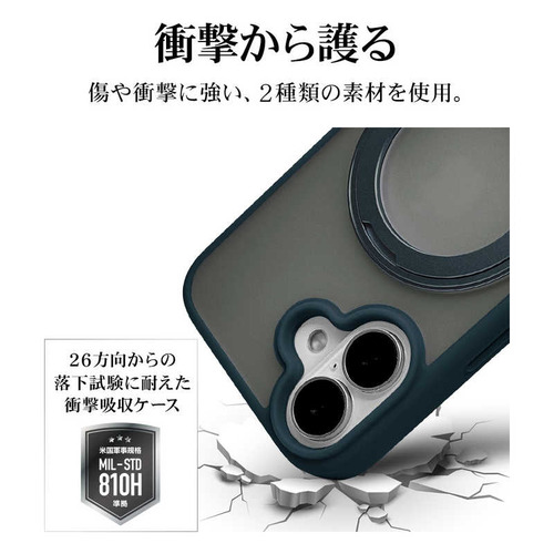 ●ボタンやカメラ周りの細部まで保護できる精密設計です。●米軍MIL規格「MIL-STD-810H」最新の衝撃基準規格に準拠。●アメリカ国防総省で定められた、米軍調達品基準に準拠した規格で、26方向からの落下試験に耐えた衝撃吸収ケースです。●指が通せて操作安心、120度開閉&360度回転でお好みの角度に調整可能な、MagSafe対応リング付き。使用しない時はスリムに収まります。※背面のリングを使用する際は必ず端末とケースを一緒に手に持ってください。リングのみを持って宙づりにしたり、振り回す等の行為はしないでください。端末の落下や本製品の破損の原因となります。●リングを開いて縦置き・横置きの視聴スタンドとしても使用できます。●柔軟性のあるTPU素材と傷に強いポリカーボネートのハイブリッドケースです。