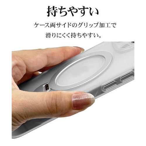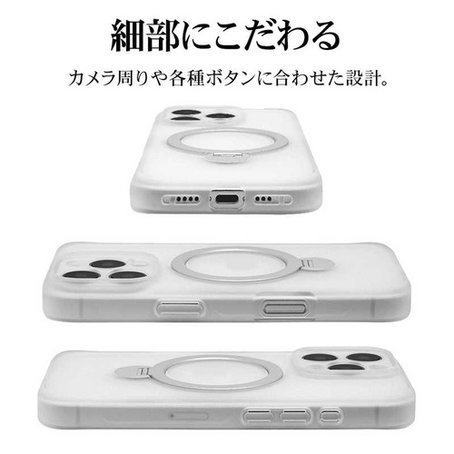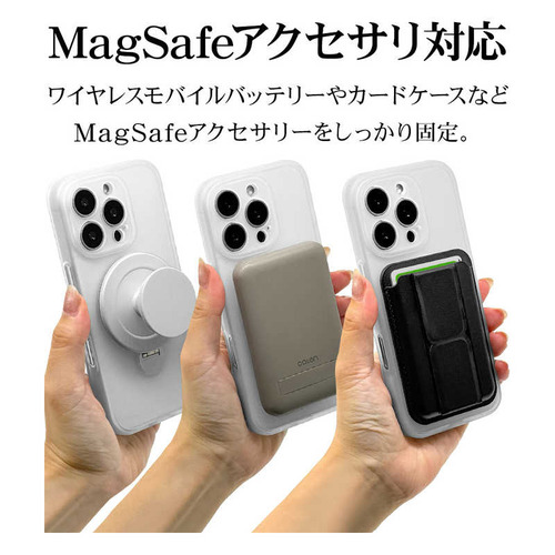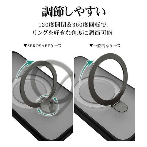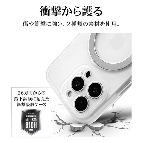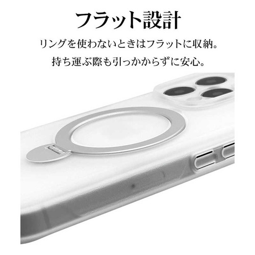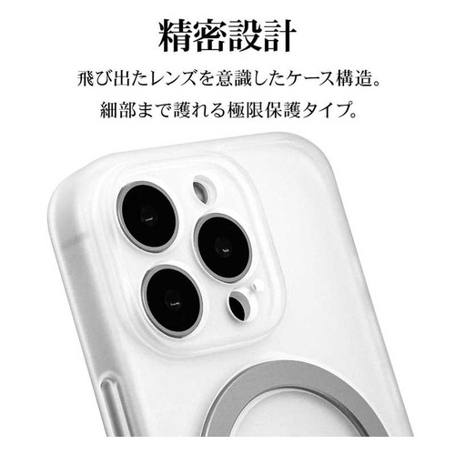 ●ボタンやカメラ周りの細部まで保護できる精密設計です。●米軍MIL規格「MIL-STD-810H」最新の衝撃基準規格に準拠。アメリカ国防総省で定められた、米軍調達品基準に準拠した規格で、26方向からの落下試験に耐えた衝撃吸収ケースです。●指が通せて操作安心、120度開閉&360度回転でお好みの角度に調整可能な、MagSafe対応リング付き。使用しない時はスリムに収まります。※背面のリングを使用する際は必ず端末とケースを一緒に手に持ってください。リングのみを持って宙づりにしたり、振り回す等の行為はしないでください。端末の落下や本製品の破損の原因となります。●リングを開いて縦置き・横置きの視聴スタンドとしても使用できます。●柔軟性のあるTPU素材と傷に強いポリカーボネートのハイブリッドケースです。●ケースをつけた状態でMagSafeアクセサリの装着や、ワイヤレス充電器による充電が可能です。※全ての環境で動作保証をするものではありません。●画面を伏せて置いてもディスプレイが直接当たりにくい形状です。●保護性能と装着感を追求した約3mm厚めのデザイン。