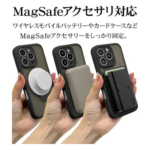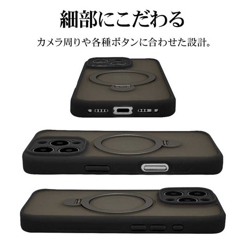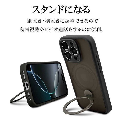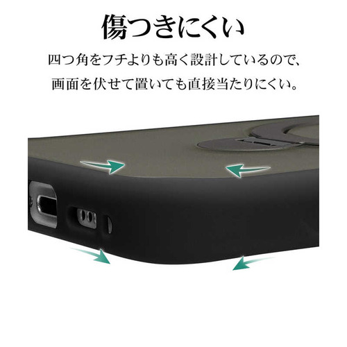●ボタンやカメラ周りの細部まで保護できる精密設計です。●米軍MIL規格「MIL-STD-810H」最新の衝撃基準規格に準拠。アメリカ国防総省で定められた、米軍調達品基準に準拠した規格で、26方向からの落下試験に耐えた衝撃吸収ケースです。●指が通せて操作安心、120度開閉&360度回転でお好みの角度に調整可能な、MagSafe対応リング付き。使用しない時はスリムに収まります。※背面のリングを使用する際は必ず端末とケースを一緒に手に持ってください。リングのみを持って宙づりにしたり、振り回す等の行為はしないでください。端末の落下や本製品の破損の原因となります。●リングを開いて縦置き・横置きの視聴スタンドとしても使用できます。●柔軟性のあるTPU素材と傷に強いポリカーボネートのハイブリッドケースです。●ケースをつけた状態でMagSafeアクセサリの装着や、ワイヤレス充電器による充電が可能です。※全ての環境で動作保証をするものではありません。●画面を伏せて置いてもディスプレイが直接当たりにくい形状です。●保護性能と装着感を追求した約3mm厚めのデザイン。