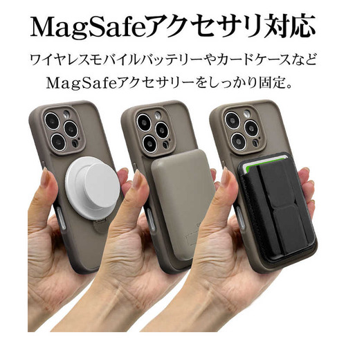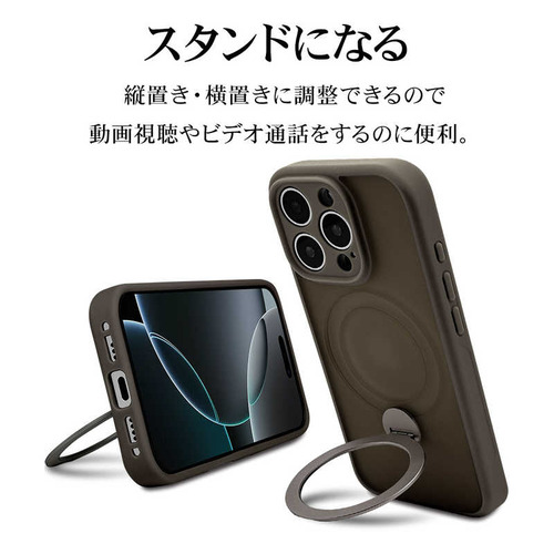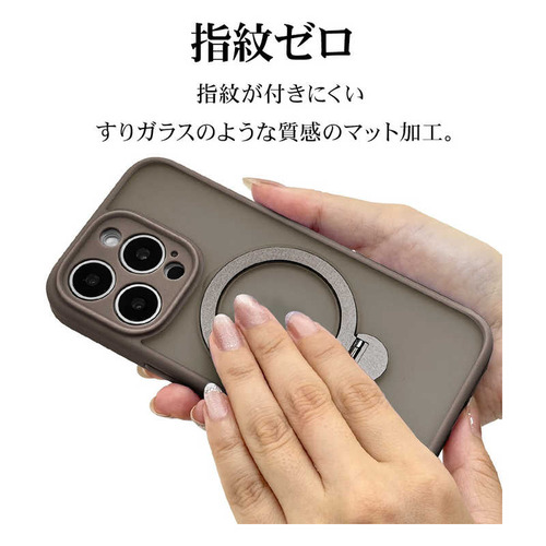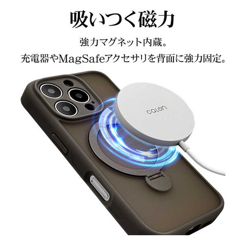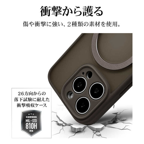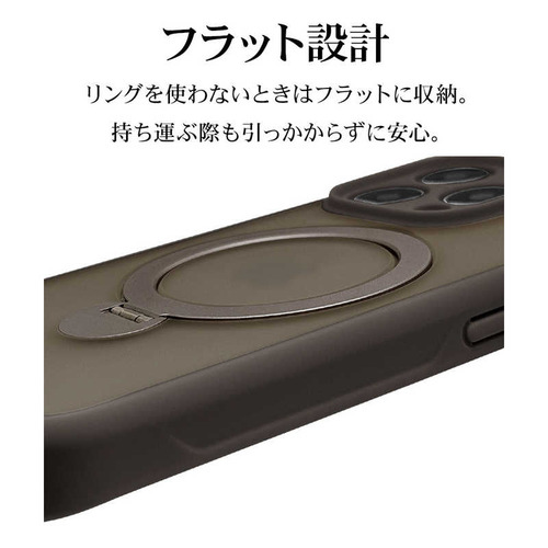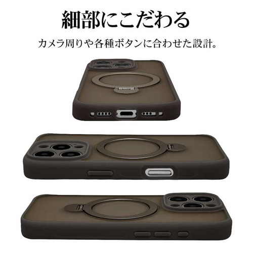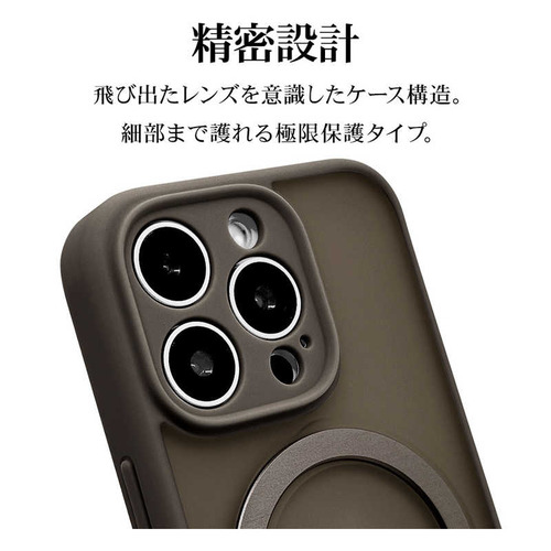 ●ボタンやカメラ周りの細部まで保護できる精密設計です。●米軍MIL規格「MIL-STD-810H」最新の衝撃基準規格に準拠。アメリカ国防総省で定められた、米軍調達品基準に準拠した規格で、26方向からの落下試験に耐えた衝撃吸収ケースです。●指が通せて操作安心、120度開閉&360度回転でお好みの角度に調整可能な、MagSafe対応リング付き。使用しない時はスリムに収まります。※背面のリングを使用する際は必ず端末とケースを一緒に手に持ってください。リングのみを持って宙づりにしたり、振り回す等の行為はしないでください。端末の落下や本製品の破損の原因となります。●リングを開いて縦置き・横置きの視聴スタンドとしても使用できます。●柔軟性のあるTPU素材と傷に強いポリカーボネートのハイブリッドケースです。●ケースをつけた状態でMagSafeアクセサリの装着や、ワイヤレス充電器による充電が可能です。※全ての環境で動作保証をするものではありません。●画面を伏せて置いてもディスプレイが直接当たりにくい形状です。●保護性能と装着感を追求した約3mm厚めのデザイン。