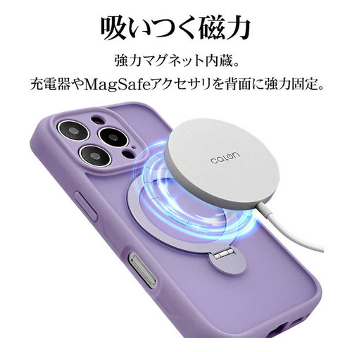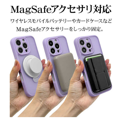 ●ボタンやカメラ周りの細部まで保護できる精密設計です。●米軍MIL規格「MIL-STD-810H」最新の衝撃基準規格に準拠。アメリカ国防総省で定められた、米軍調達品基準に準拠した規格で、26方向からの落下試験に耐えた衝撃吸収ケースです。●指が通せて操作安心、120度開閉&360度回転でお好みの角度に調整可能な、MagSafe対応リング付き。使用しない時はスリムに収まります。※背面のリングを使用する際は必ず端末とケースを一緒に手に持ってください。リングのみを持って宙づりにしたり、振り回す等の行為はしないでください。端末の落下や本製品の破損の原因となります。●リングを開いて縦置き・横置きの視聴スタンドとしても使用できます。●柔軟性のあるTPU素材と傷に強いポリカーボネートのハイブリッドケースです。●ケースをつけた状態でMagSafeアクセサリの装着や、ワイヤレス充電器による充電が可能です。※全ての環境で動作保証をするものではありません。●画面を伏せて置いてもディスプレイが直接当たりにくい形状です。●保護性能と装着感を追求した約3mm厚めのデザイン。