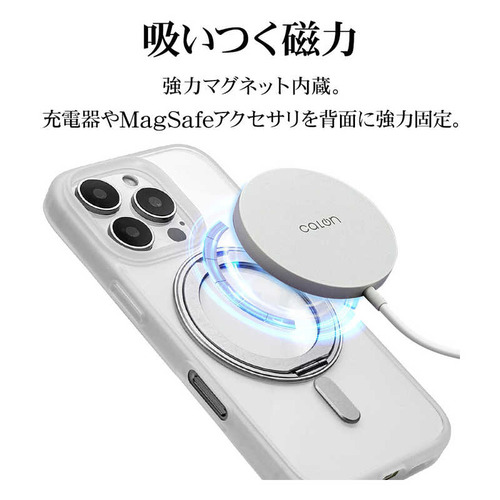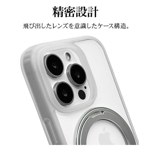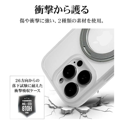 ●ボタンやカメラ周りの細部まで保護できる精密設計です。●米軍MIL規格「MIL-STD-810H」最新の衝撃基準規格に準拠。●アメリカ国防総省で定められた、米軍調達品基準に準拠した規格で、26方向からの落下試験に耐えた衝撃吸収ケースです。●指が通せて操作安心、120度開閉&360度回転でお好みの角度に調整可能な、MagSafe対応リング付き。使用しない時はスリムに収まります。※背面のリングを使用する際は必ず端末とケースを一緒に手に持ってください。リングのみを持って宙づりにしたり、振り回す等の行為はしないでください。端末の落下や本製品の破損の原因となります。●リングを開いて縦置き・横置きの視聴スタンドとしても使用できます。●柔軟性のあるTPU素材と傷に強いポリカーボネートのハイブリッドケースです。