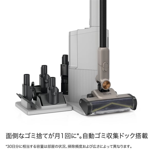 付属品:ブラシ付き隙間用ノズル、ペットマルチノズル、布団ノズル、ミニモーターヘッド、自動ゴミ収集ドック(充電機能付き)、アクセサリードック、リチウムイオンバッテリー1個