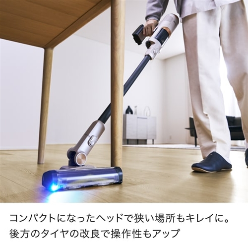 青色LEDヘッドライトが床のゴミやホコリを浮かび上がらせ、可視化することで取り残しを防ぐ。