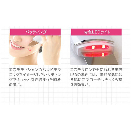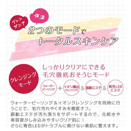 ●ウォーターピーリング搭載 生活防水(IPX5)音波振動で水をミスト状にして、毛穴の汚れを吹き飛ばして落とします。スクラブや毛穴パックよりお肌にやさしくツルツル肌に。生活防水(IPX5)で安心。●EMS機能搭載EMS機能により筋肉運動が起こり、表情筋が鍛えられほうれい線などの気になる部分がキュッと引き締められます。●イオン導入・導出イオン導出は「イオンクレンジング」とも呼ばれ、マイナスイオン因子を持った毛穴汚れをプラスイオンの力で吸着します。通常の洗顔では取りきれない毛穴の汚れまでしっかりオフする事ができます。イオン導入で美容成分をイオン化させ、肌に届けやすい状態にしてから深部まで導入。同時に振動マッサージ機能も作動し、肌を柔らかくして浸透効果を高めます。●光エステで肌の悩みに直接アプローチ美容用LEDライトを使用したフォトフェイシャル機能。2カラーのそれぞれ波長が異なったライトが気になる肌の悩みに直接アプローチ。●ボタンを押すだけで2パターン選べる簡単操作電源を入れてから操作ボタンを押すとクレンジングモードに。ウォーターピーリング・イオン導出・振動エステ・青色LEDが同時に稼動。再度操作ボタンを押すとリフトアップモードに。パッティング・イオン導入・EMS・赤色LEDが同時に稼動します。