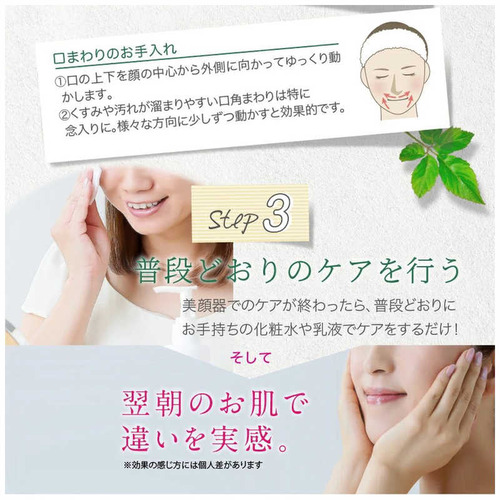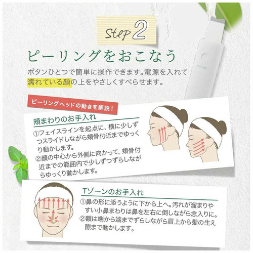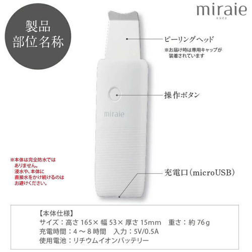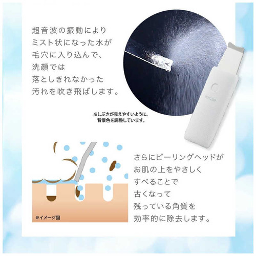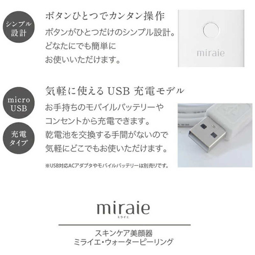 ●シンプルで使いやすいスキンケアの基礎である『ウォーターピーリング機能』のみを搭載しています。●超音波の振動超音波の振動によりミスト状になった水が毛穴に入り込んで、洗顔では落としきれなかった汚れを吹き飛ばします。さらにピーリングヘッドがお肌の上をやさしくすべることで古くなって残っている角質を効率的に除去します。●ボタンひとつでカンタン操作ボタンがひとつだけのシンプル設計。どなたにでも簡単にお使いいただけます。●気軽に使えるUSB充電モデルお手持ちのモバイルバッテリーやコンセントから充電できます。乾電池を交換する手間がないので気軽にどこでもお使いいただけます。※USB対応ACアダプタやモバイルバッテリーは別売りです。
