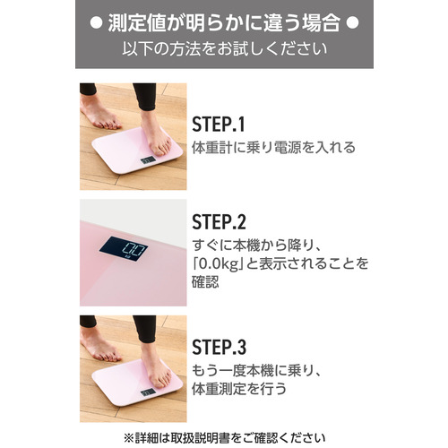 体重計精度:2.5kg以上〜75kg以下:±200g、75kg超え〜100kg以下:±300g、100kg超え〜150kg:±600g