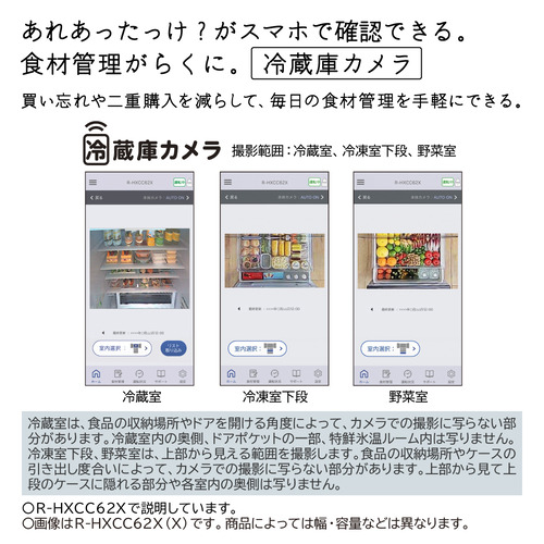 ※2 冷蔵室は、食品の収納場所やドアを開ける角度によって、カメラでの撮影に写らない部分があります。冷凍室下段、野菜室は、上部から見える範囲を撮影します。