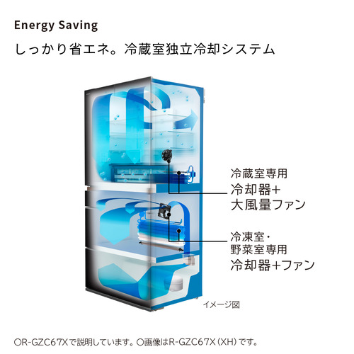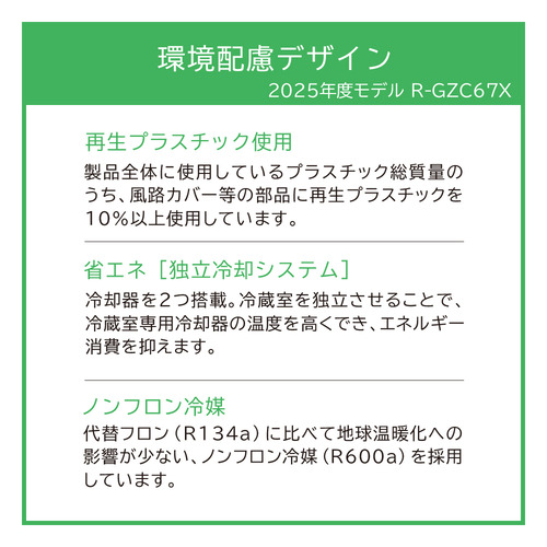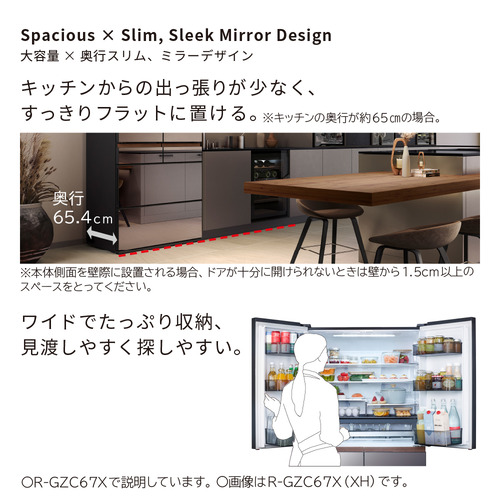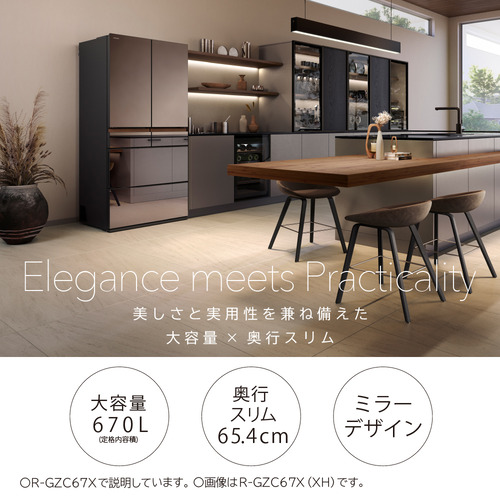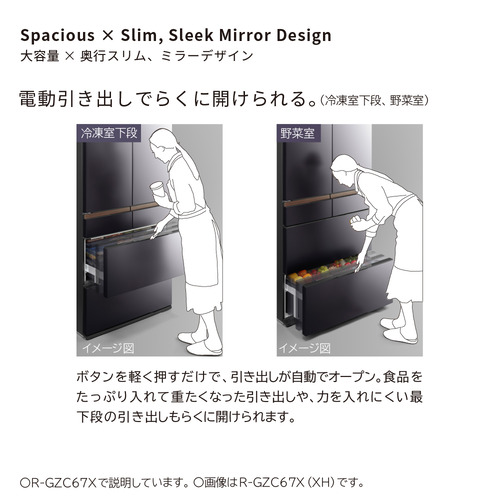 大容量670L、奥行スリムな65.4cm(本体奥行)で庫内を奥まで見渡しやすく、収納したものを探しやすく設計しています。ハンドル部分には木目調のアクセントを取り入れ、高級感を演出。さらに冷凍室・野菜室には電動引き出しを採用し、使い勝手にも配慮しています。