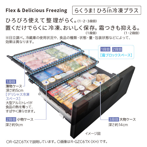 冷凍室下段は、[3段ケース]採用でひろびろ使えて整理がらく。1段目はアルミトレイに置くだけでらくに冷凍できる[デリシャス冷凍]でおいしく保存(※2)、らくにすばやくホームフリージングできます。また、1・2段目は霜つきを抑える[霜ブロック]で霜の発生や食材のパサつきを抑えて保存できます(※2)。