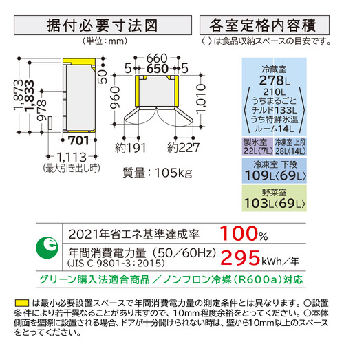 各室定格内容積(JIS C 9801:2015) (<>内は「食品収納スペースの目安」です。):冷蔵室278L<210L> 製氷室 22L<7L> 上段冷凍室28L<14L> 下段冷凍室109L<69L> 野菜室103L <69L>
