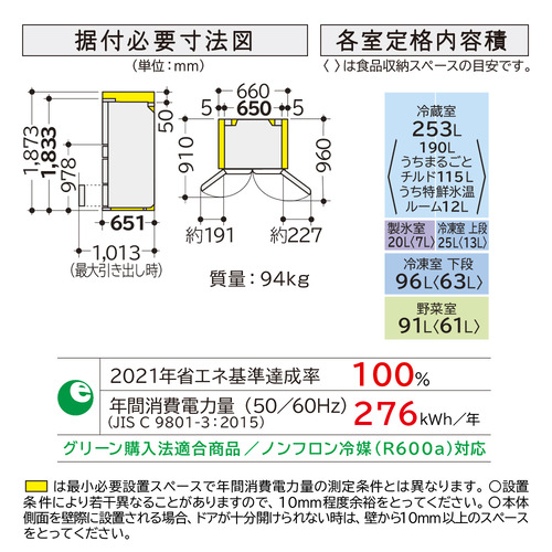 各室定格内容積(JIS C 9801:2015) (<>内は「食品収納スペースの目安」です。):冷蔵室253L<190L> 製氷室20L<7L> 上段冷凍室25L<13L> 下段冷凍室96L<63L> 野菜室91L <61L>