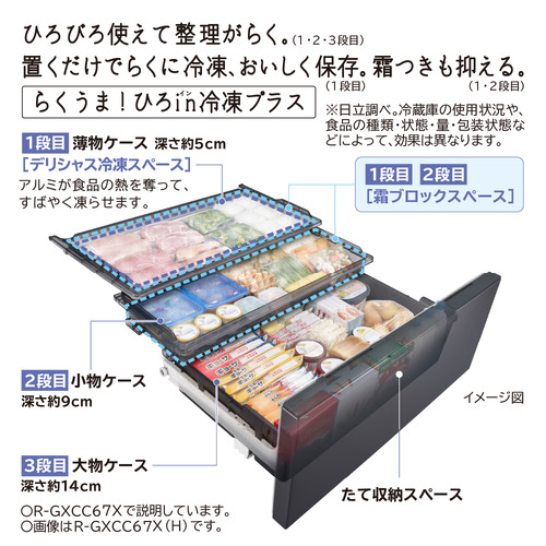 大容量194L(※1)の冷凍室。冷凍室下段は、[3段ケース]採用でひろびろ使えて整理がらく。1段目はアルミトレイに置くだけでらくに冷凍できる[デリシャス冷凍]でおいしく保存(※2)、らくにすばやくホームフリージングできます。また、1・2段目は霜つきを抑える[霜ブロック]で霜の発生や食材のパサつきを抑えて保存できます(※2)。
