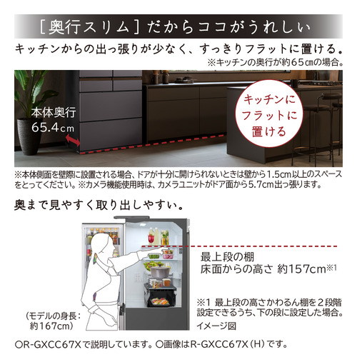 ゆとりの大容量670Lで、奥行スリム65.4cm。キッチンからの出っ張りが少なく(※)、すっきりフラットに置けます。奥行スリムだから庫内の奥に入っている食品が見やすく、取り出しやすいです。本体幅は88cmとワイドなので、たっぷり収納した食品が見渡しやすく、探しやすくなるなど、使い勝手が充実しています。 また、食品をたっぷり入れて重くなった引き出しも、ボタンを軽く押すだけでラクに引き出せる「電動引き出し」(冷凍室下段、野菜室)を採用しています。