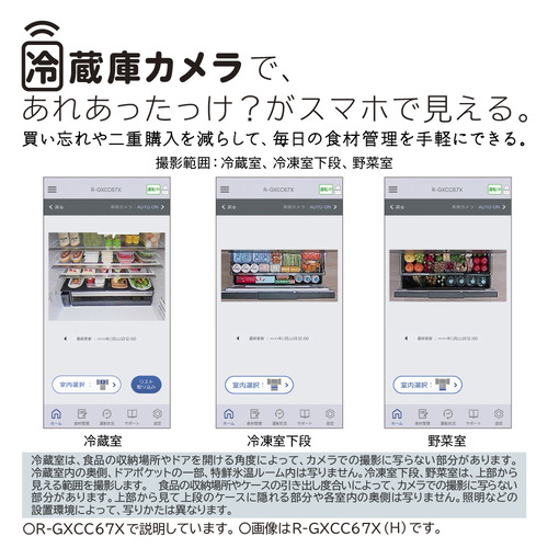 ※1 「冷蔵庫カメラ」の利用には「日立冷蔵庫コンシェルジュアプリ」を使用して、スマートフォンと冷蔵庫本体との連携が必要です。出荷時、アプリはオフ設定。オンにしたときは消費電力量が増加します。
