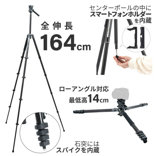 センターポールの中にスマートフォンホルダーを内蔵(アルカスイス規格に対応しており、雲台に直接取付け可能)