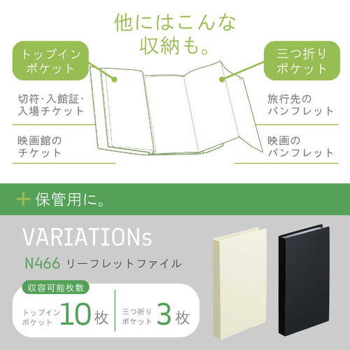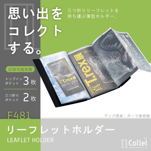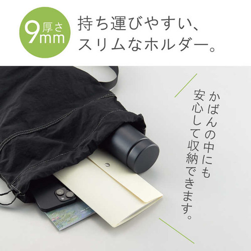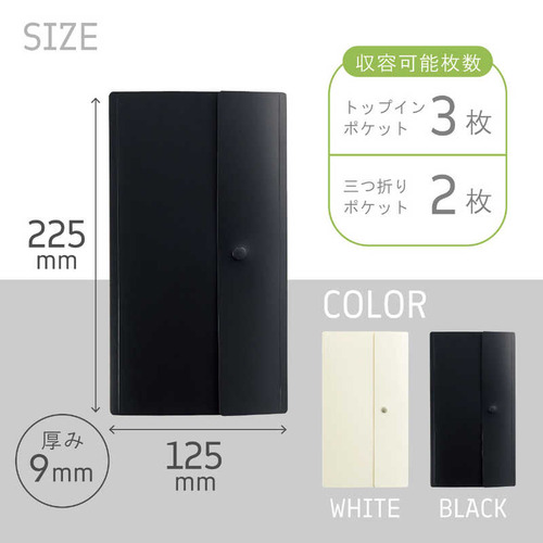 ●三つ折りのリーフレットをそのまま収納できるトップインポケット トップインポケットには三つ折りのままのA4リーフレットやチケットをそのまま入れられます。映画のチケットや切符、入館証の収納にも便利です。 A4リーフレットを広げて入れられる三つ折りポケット A4リーフレットを広げて入れられる三つ折りポケットで、リーフレットの角を折らずに収納できます。旅行先でもらったパンフレットの収納にも便利です。 持ち運びに便利なスリムサイズ バッグに入れて持ち運びに便利なスリムサイズです。フラップにはホック付きでかさばりません。●本体寸法:幅×奥行×高さ 125×9×225mm●本体重量:68g●材質:表紙/ポリプロピレン(生地厚0.5mm)、ポケット/ポリプロピレン(トップインポケット生地厚0.06mm、三つ折りポケット生地厚0.1mm)、ホック/真鍮●色:ブラック※※収納物は、よく乾燥のうえポケットに入れてください。