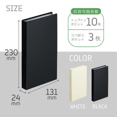 ●三つ折りのリーフレットをそのまま収納できるトップインポケット トップインポケットには三つ折りのままのA4リーフレットやチケットをそのまま入れられます。映画のチケットや切符、入館証の収納にも便利です。 A4リーフレットを広げて入れられる三つ折りポケット A4リーフレットを広げて入れられる三つ折りポケットで、リーフレットの角を折らずに収納できます。旅行先でもらったパンフレットの収納にも便利です。 インテリアに馴染むシンプルデザイン 棚に収納してもスッキリ収まる、コンパクトなファイルです。●本体寸法:幅×奥行×高さ 131×24×230mm●本体重量:127g●材質:表紙/ポリプロピレン(生地厚1.0mm)、ポケット/ポリプロピレン(トップインポケット生地厚0.06mm、三つ折りポケット生地厚0.1mm)●色:ブラック※※収納物は、よく乾燥のうえポケットに入れてください。