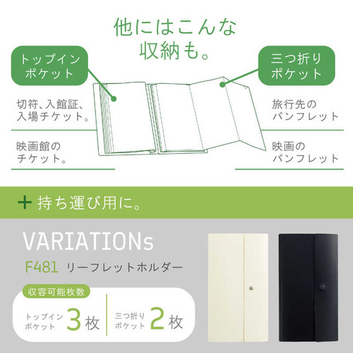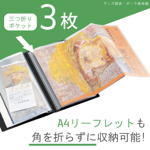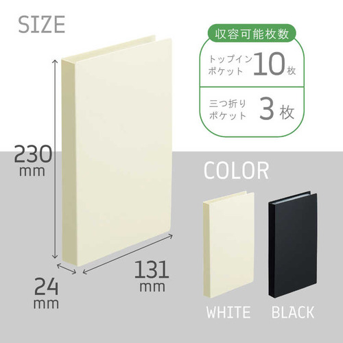 ●三つ折りのリーフレットをそのまま収納できるトップインポケット トップインポケットには三つ折りのままのA4リーフレットやチケットをそのまま入れられます。映画のチケットや切符、入館証の収納にも便利です。 A4リーフレットを広げて入れられる三つ折りポケット A4リーフレットを広げて入れられる三つ折りポケットで、リーフレットの角を折らずに収納できます。旅行先でもらったパンフレットの収納にも便利です。 インテリアに馴染むシンプルデザイン 棚に収納してもスッキリ収まる、コンパクトなファイルです。●本体寸法:幅×奥行×高さ 131×24×230mm●本体重量:127g●材質:表紙/ポリプロピレン(生地厚1.0mm)、ポケット/ポリプロピレン(トップインポケット生地厚0.06mm、三つ折りポケット生地厚0.1mm)●色:ホワイト※※収納物は、よく乾燥のうえポケットに入れてください。